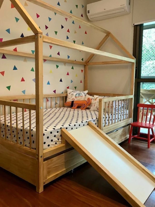A estrutura em formato de casinha é um convite à imaginação! Você pode decorá-la com luzinhas, bandeirolas ou almofadas, criando um espaço cheio de encanto e aconchego. E o melhor: a parte superior é removível, se transformando em uma charmosa casinha para as brincadeiras do dia a dia. E pra deixar tudo ainda mais divertido, um escorregador removível que é pura diversão!